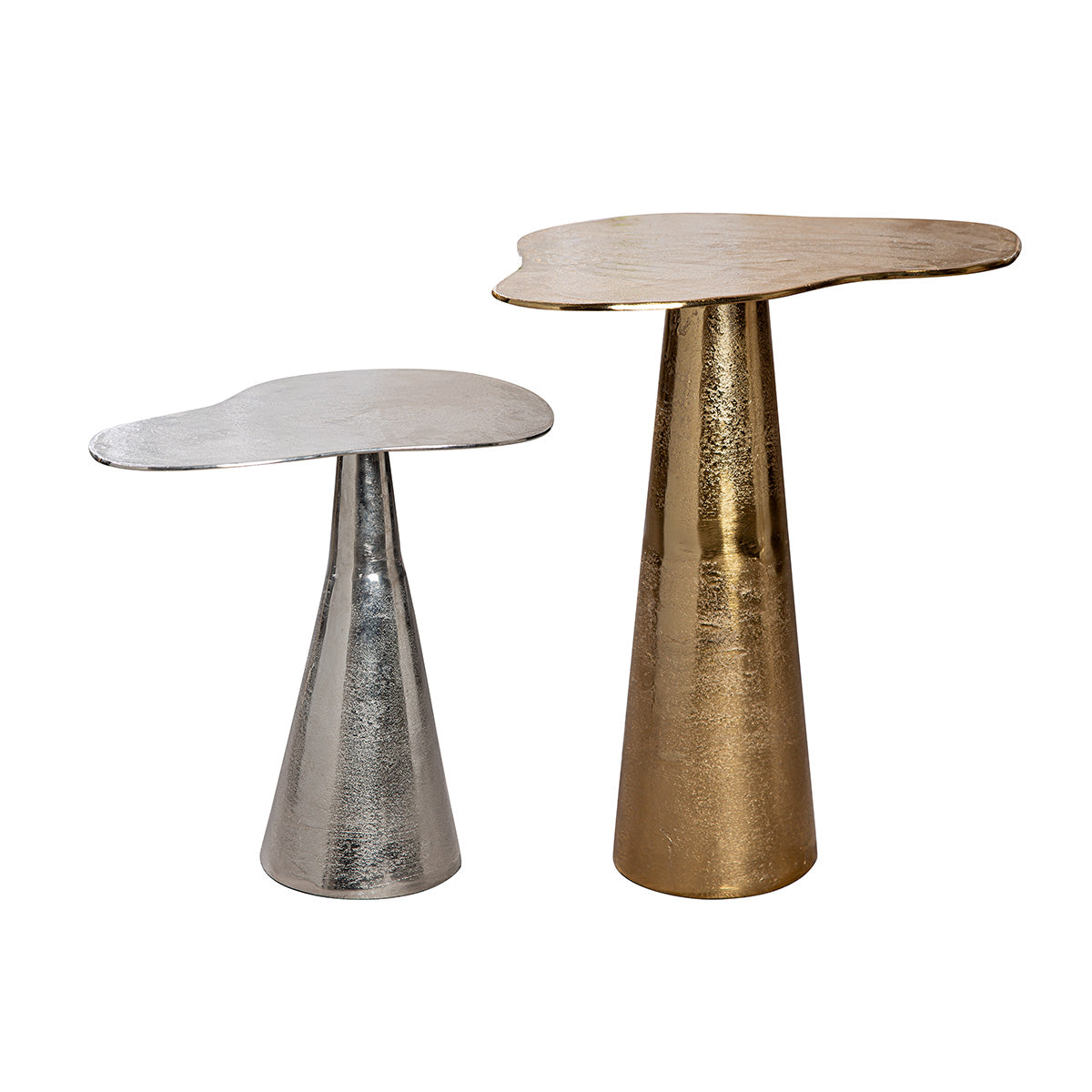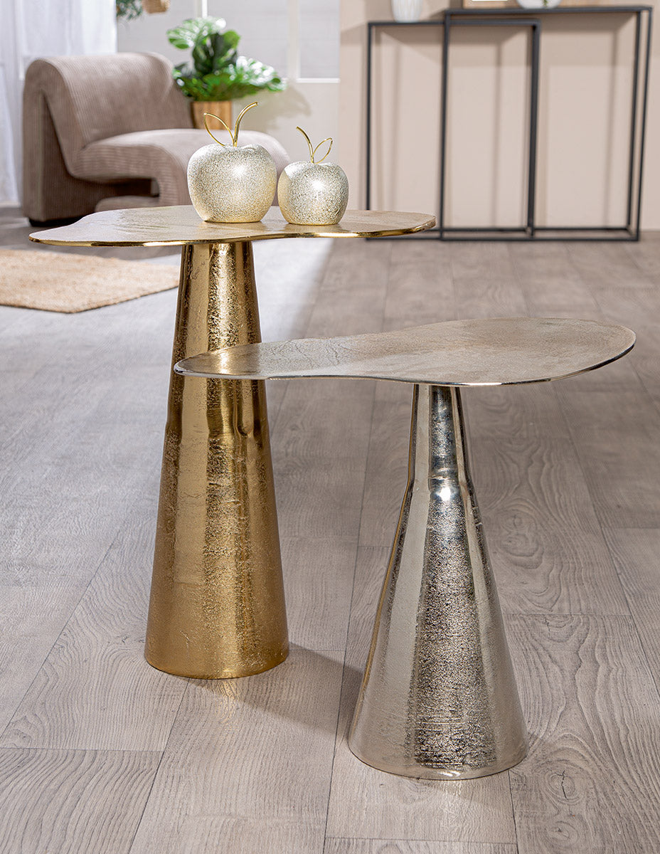 Material: Aluminium mit metallische Optik OberflÀche Farbe: goldfarben, silberfarben Form: Organisch Set: 2 Beistelltische Eigenschaften: Stabil, pflegeleicht und vielseitig einsetzbar