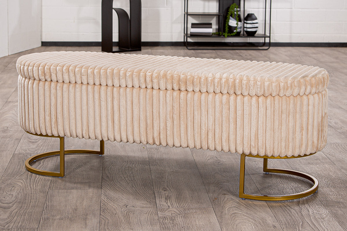 Die elegante Sitzbank „Brooklyn“ überzeugt durch ihr modernes Design und praktische Funktionalität. Der weiche Stoffbezug in edlem Beige verleiht ihr eine luxuriöse Note, während das stabile Gestell mit seinen geschwungenen Beinen für einen modernen Look sorgt.