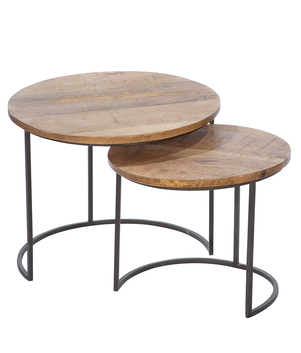 Material: Mangoholz, Metall Farbe: Naturfarben, Schwarz OberflĂ€che: Pulverbeschichtet Form: Rund Set: 2-teilig MaĂe: â klein: 45 Ă 45 Ă 39 cm â groĂ: 55 Ă 55 Ă 45 cm