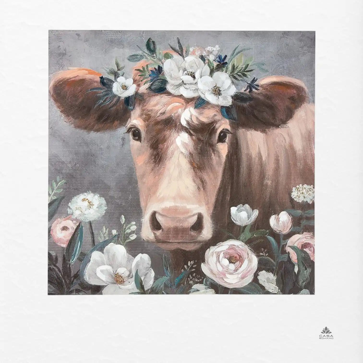 „Blumenkuh“ – Quadratisches Leinwandbild mit Kuhmotiv