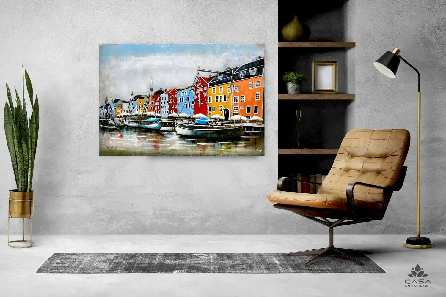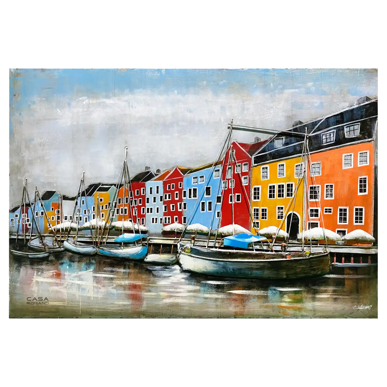 „Hafen Ambiente“ – 3D-Optik Metallbild, handbemalt 120×80 cm